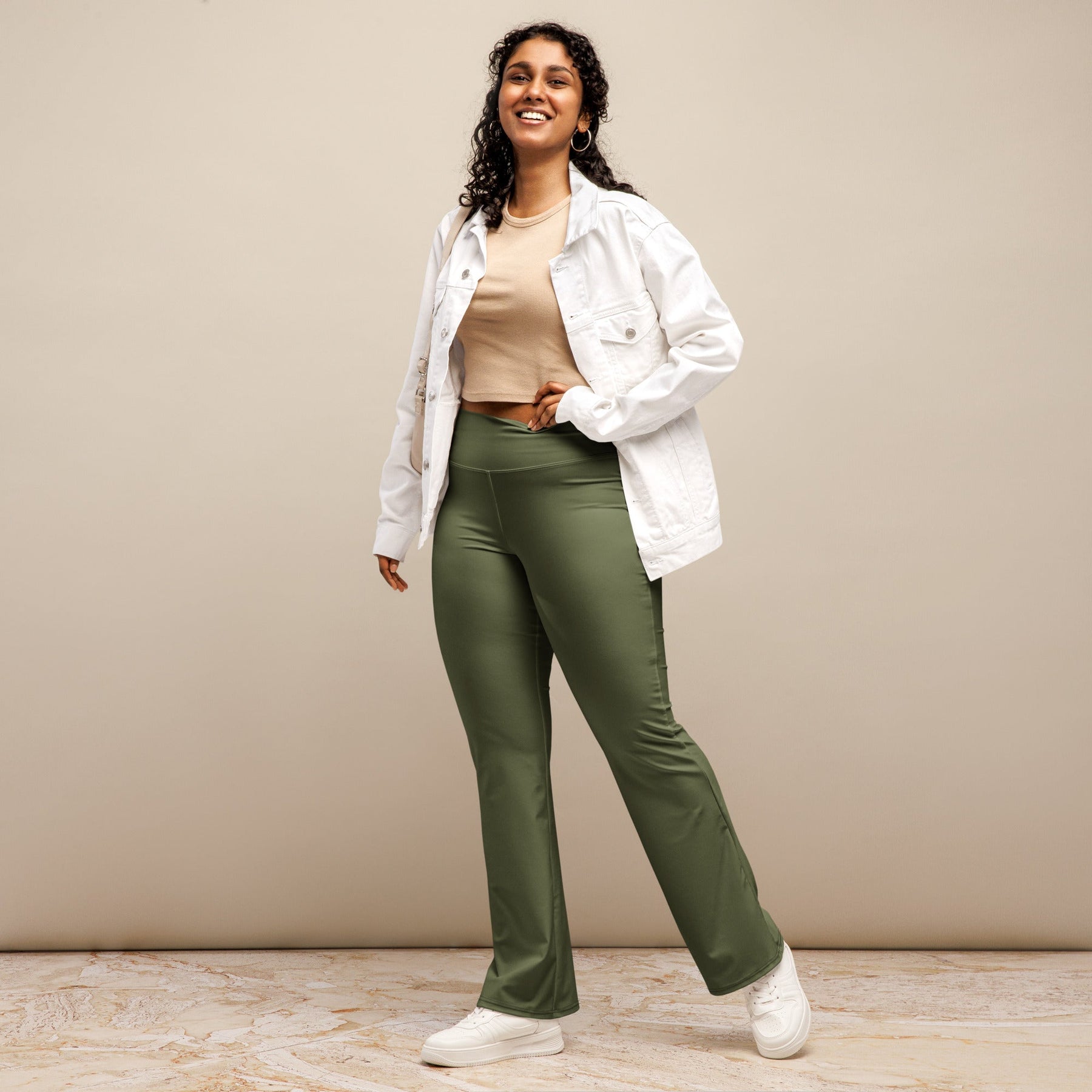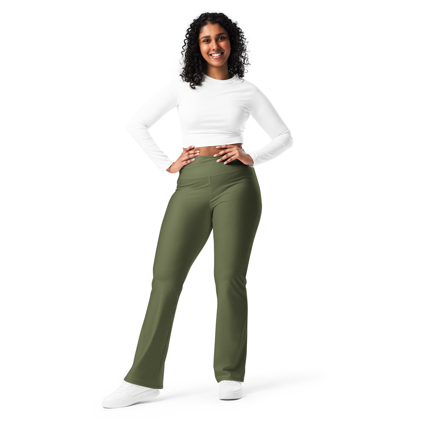 Designed to enhance your figure, these trendy leggings feature a high waist and a butt-lifting cut. The flared leg bottoms add a touch of style and make the leggings comfortable. Wear them on a walk, to the gym, or style them up with a bomber jacket or hoodie.